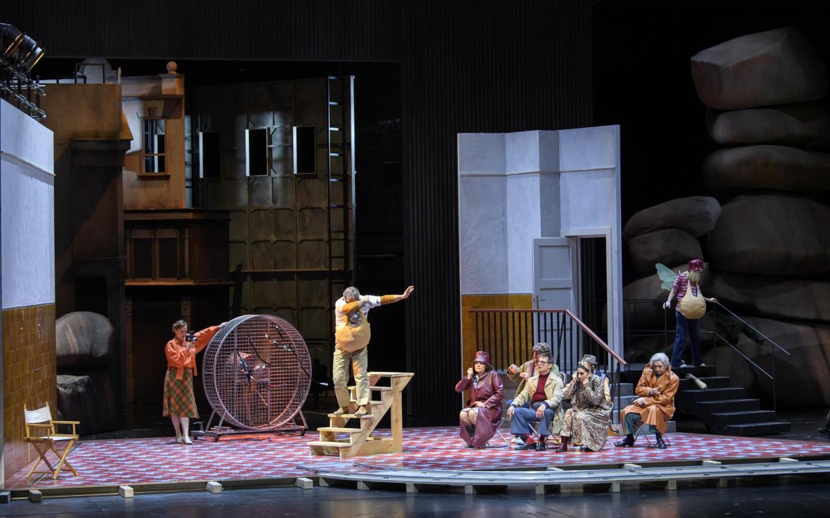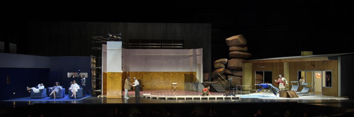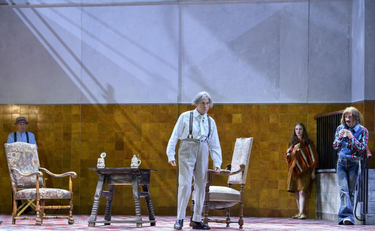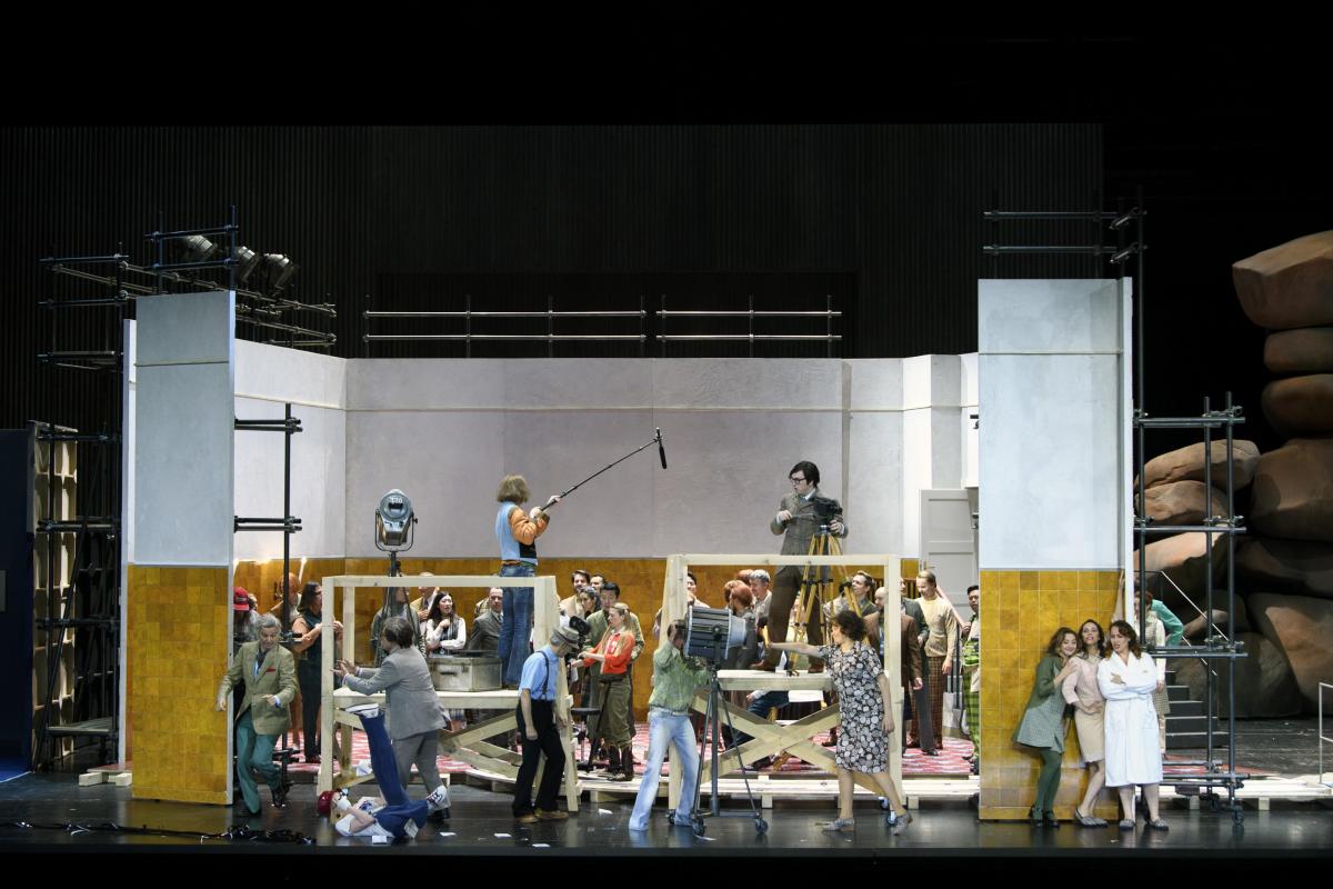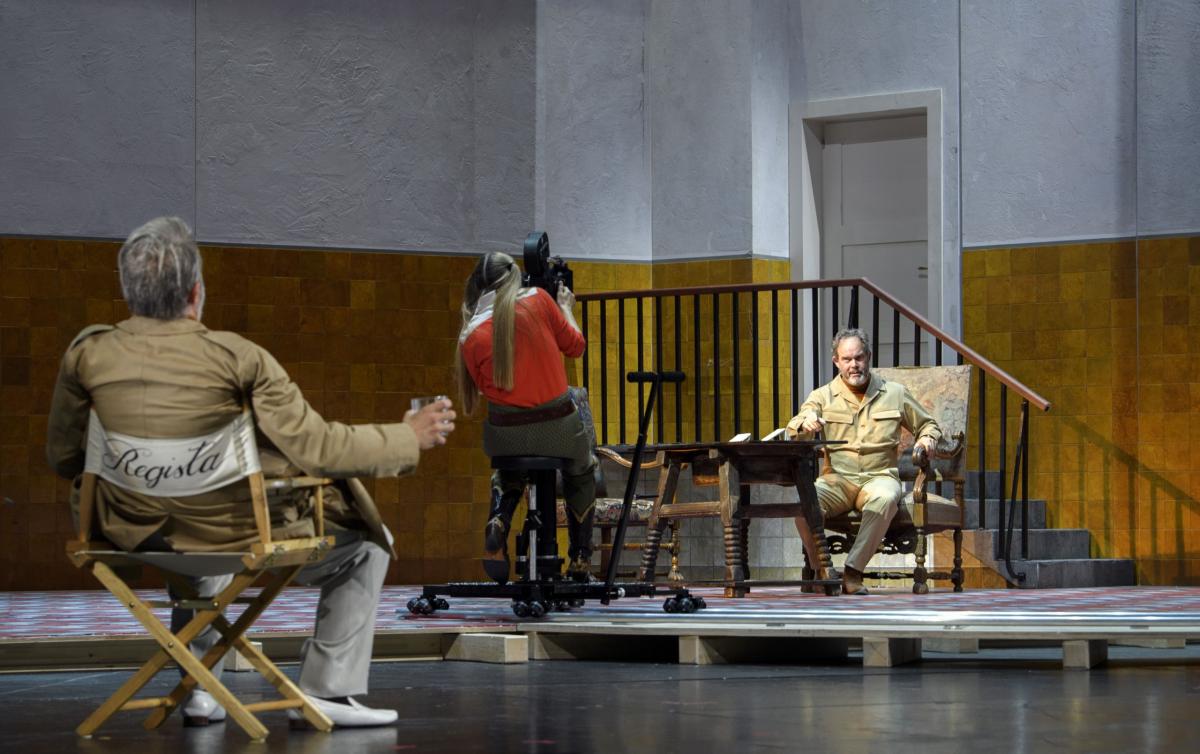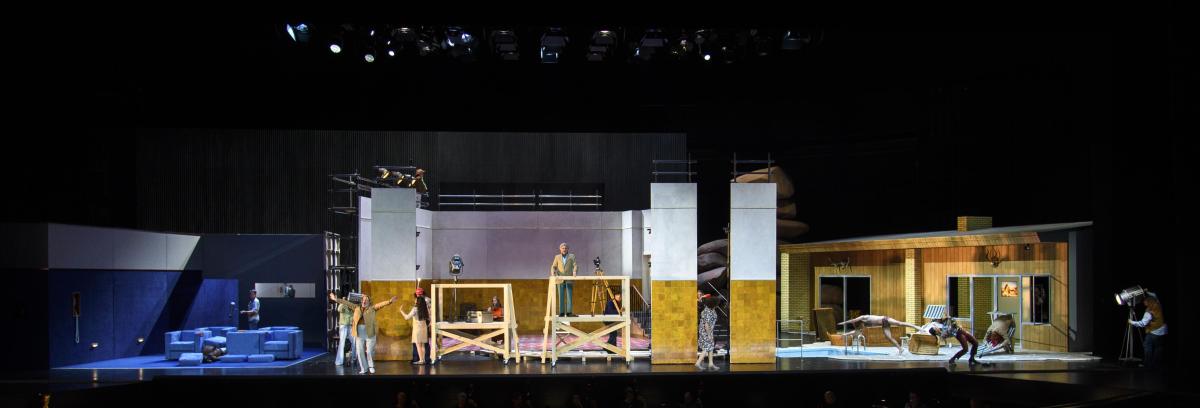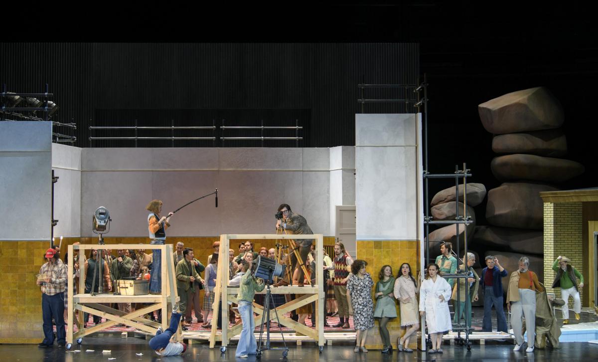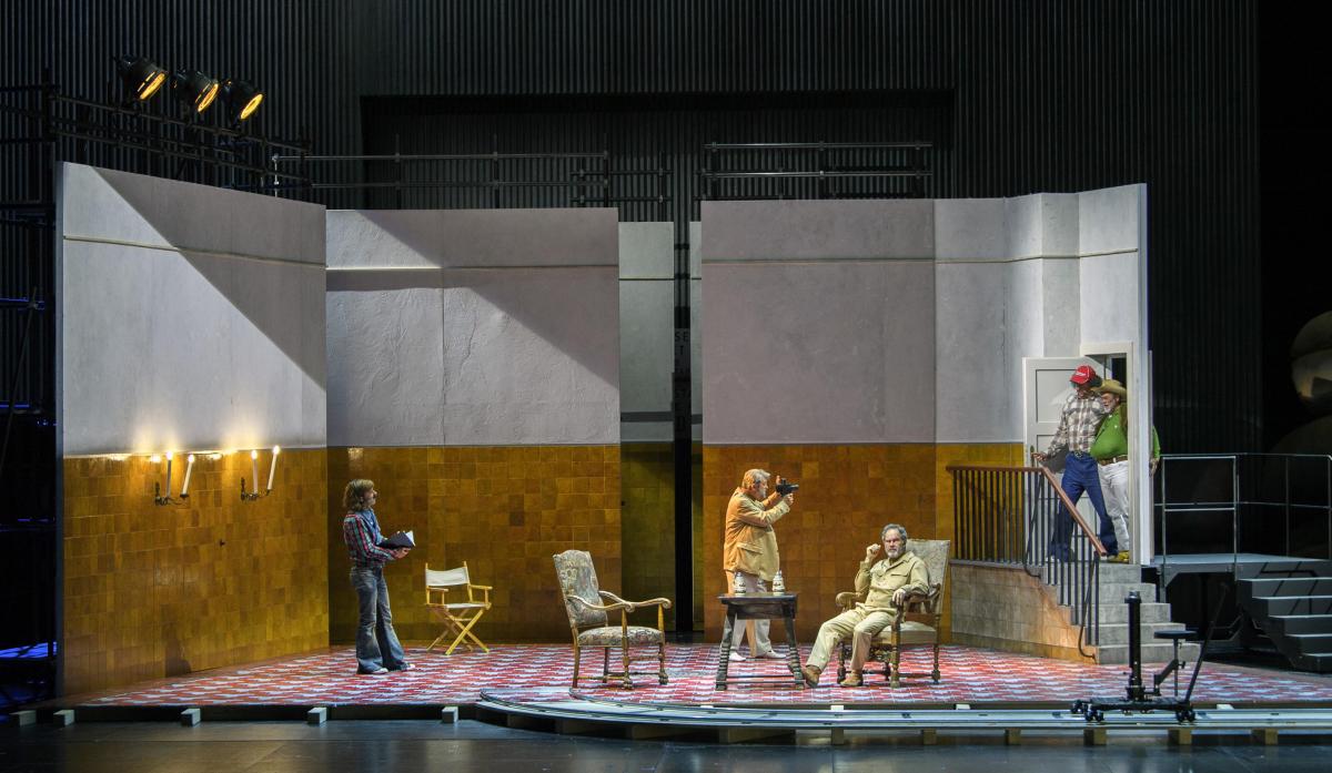 Режиссер Кристоф Марталер переносит действие знаменитой «шекспировской» оперы на съемочную площадку 1960-х годов — своеобразный оммаж голливудскому гению Орсону Уэллсу, который в свое время играл Фальстафа и снял о нем картину.