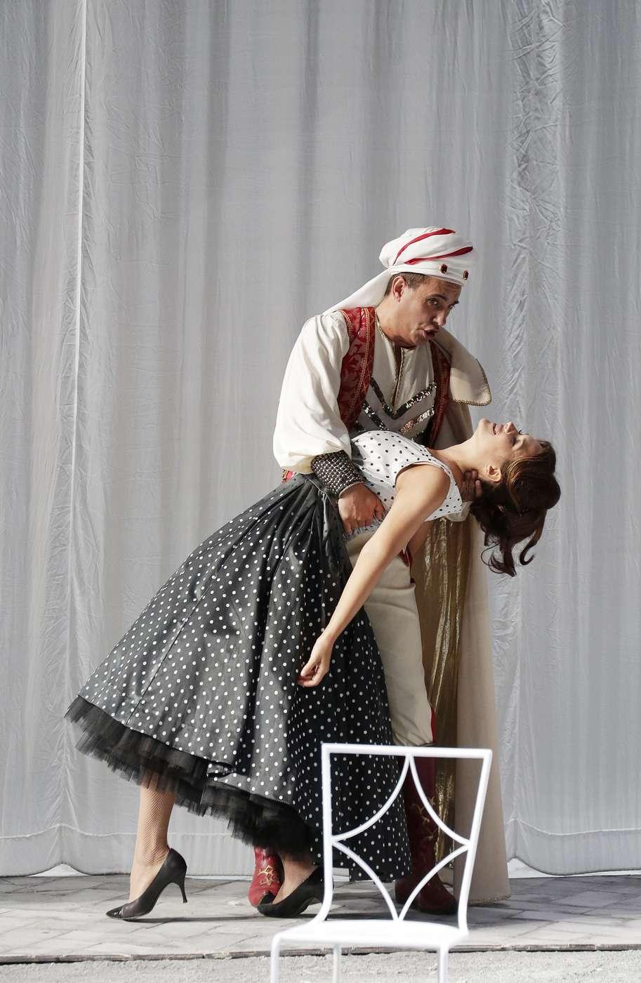 Звезда постановки Ольга Перетятько (Фьорилла) приезжает на скутере в платье в черно-белый горошек, будто сошла с экрана «Сладкой жизни». И совершенно бесподобен рядом с ней турок Селим (Эрвин Шротт в образе Белого шейха). А роль-аллюзия на самого Федерико Феллини — у Пьетро Спаньоли (Дон Просдочимо).