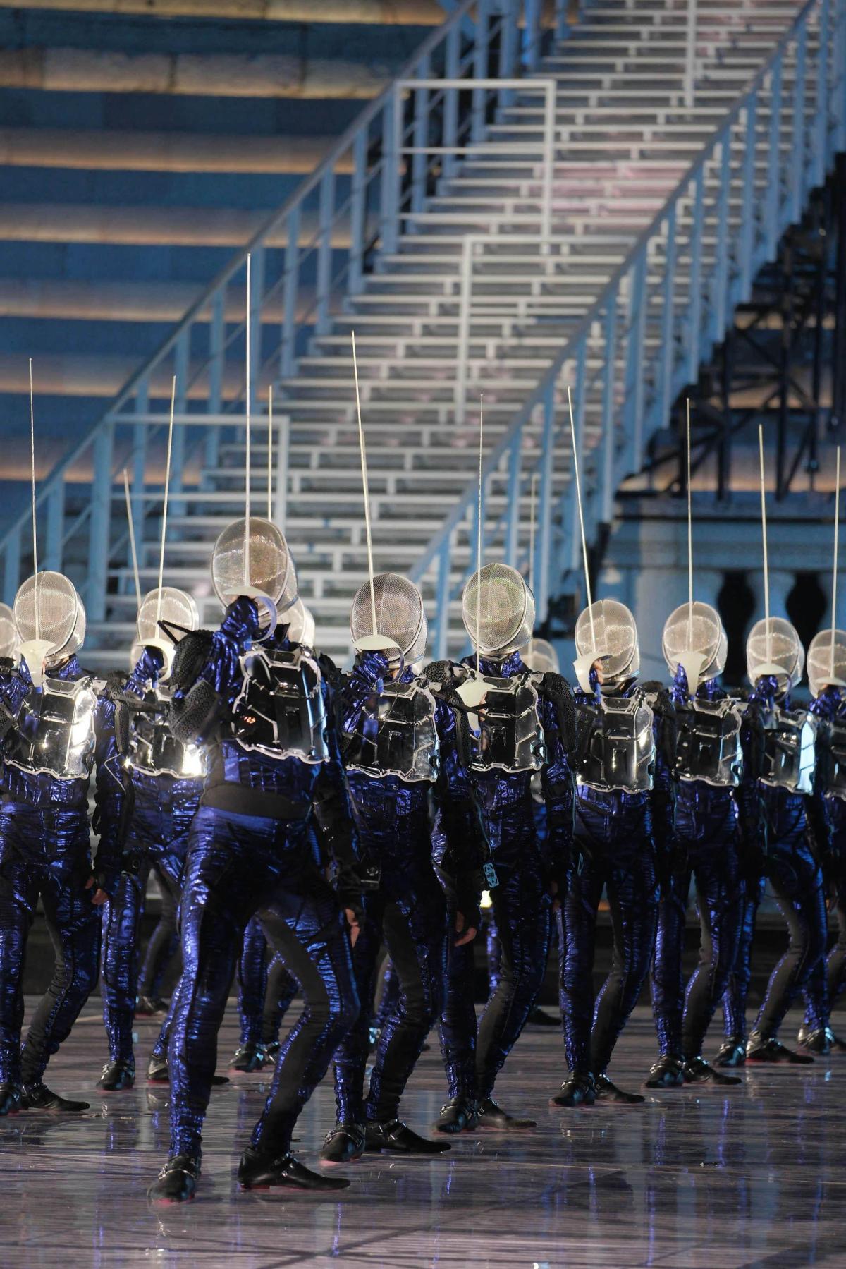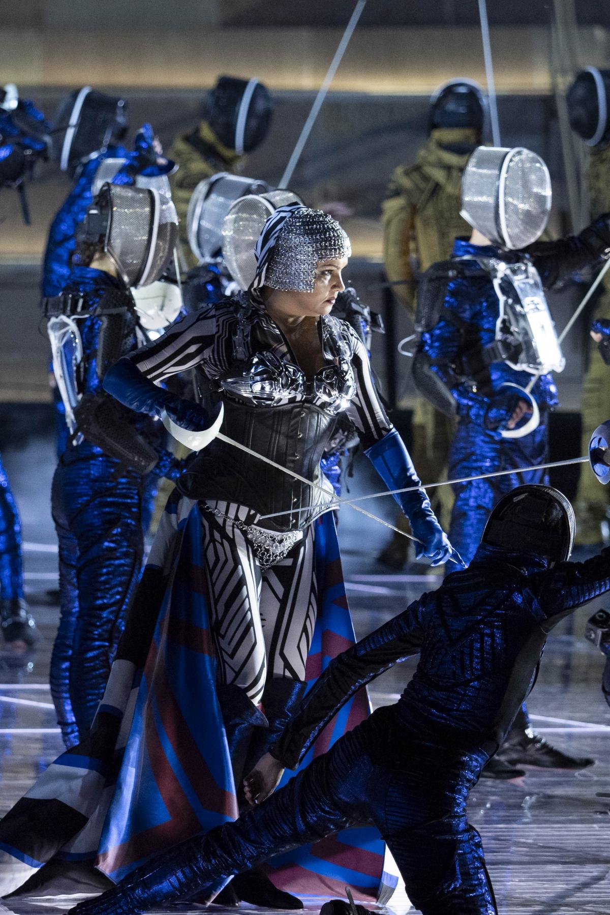 В своей интерпретации Пода убирает исторический контекст. Мощное режиссерское высказывание — в самом визуале спектакля: совершенно космические костюмы, фантастическая пластическая драматургия со сложными балетным и фехтовальными сценами; две грандиозные металлические конструкции, олицетворяющие враждующие народы, наполняют постановку вневременным символизмом.