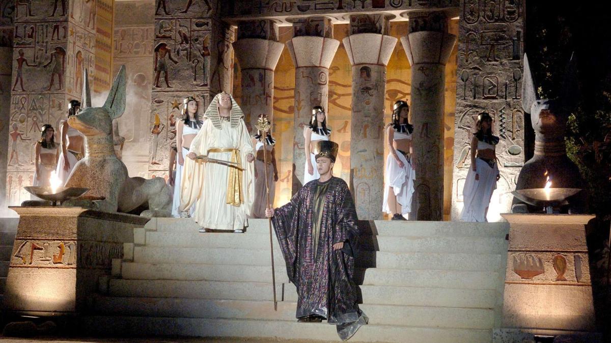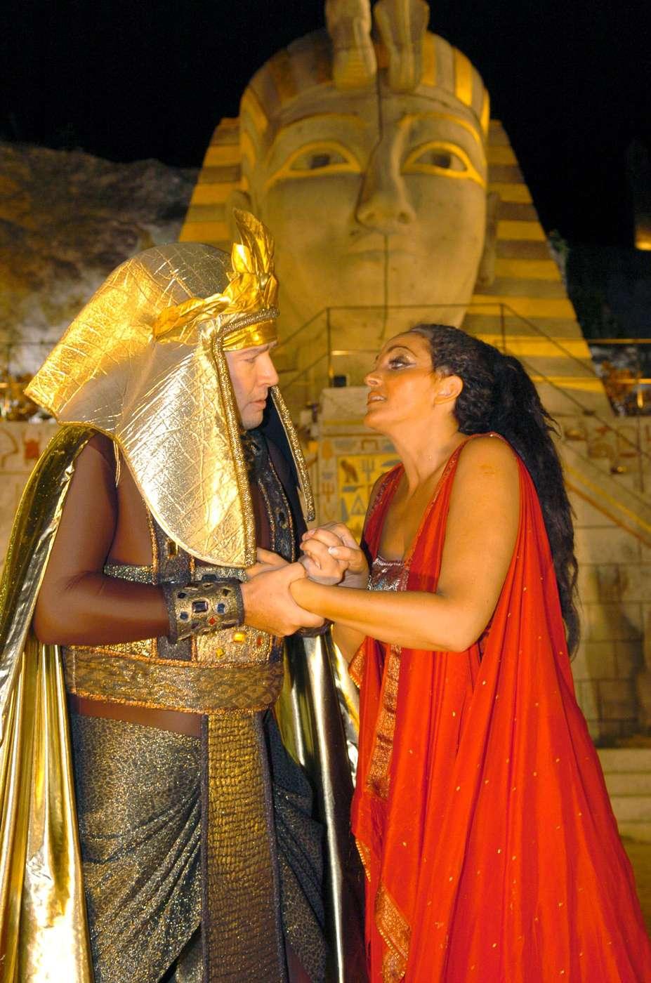 История запретной любви между египетским военачальником Радамесом и прекрасной эфиопской принцессой Аидой словно переносят зрителей в настоящий Древний Та-Кемет: более 400 участников на сцене, пиротехнические спецэффекты, лошади, колесницы и даже слоны. И это не степенно шагающие театральные животные — лошади и колесницы въезжают рысью и часто переходят в галоп. Слоны взрослые и по-настоящему огромные. Священный танец жриц и танец после Триумфального марша исполняют десятки артистов. Древние египетские статуи освещены огромным количеством полыхающих факелов, а храм насчитывает несколько этажей и далек от условной декорации.