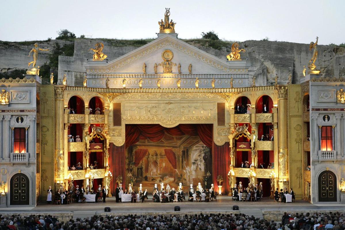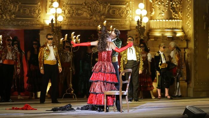 Декорации на открытом воздухе потрясающие: мы в огромной римской каменоломне; и «Травиата», самое камерное произведение Верди, — пожалуй, первая опера в Санкт-Маргаретен, в которой нет ни лошадей, ни диких животных. Художник Манфред Ваба поместил действие в воссозданную Парижскую оперу. Сперва мы видим фасад огромного здания, но затем створки раздвигаются — и перед нами сцена, ложи и фойе. В ложах — богатые меценаты-покровители, на сцене — танцовщицы и певицы, вокруг — зрители и сочувствующие. Парижская опера трансформируется в особняк Виолетты, в деревенскую виллу и, наконец, становится местом последних минут куртизанки. Софиты сменяются летним солнцем, ему на смену приходит тревожное зыбкое пламя свечей. Вся жизнь этой женщины прошла точно на сцене под взглядами любопытной публики.